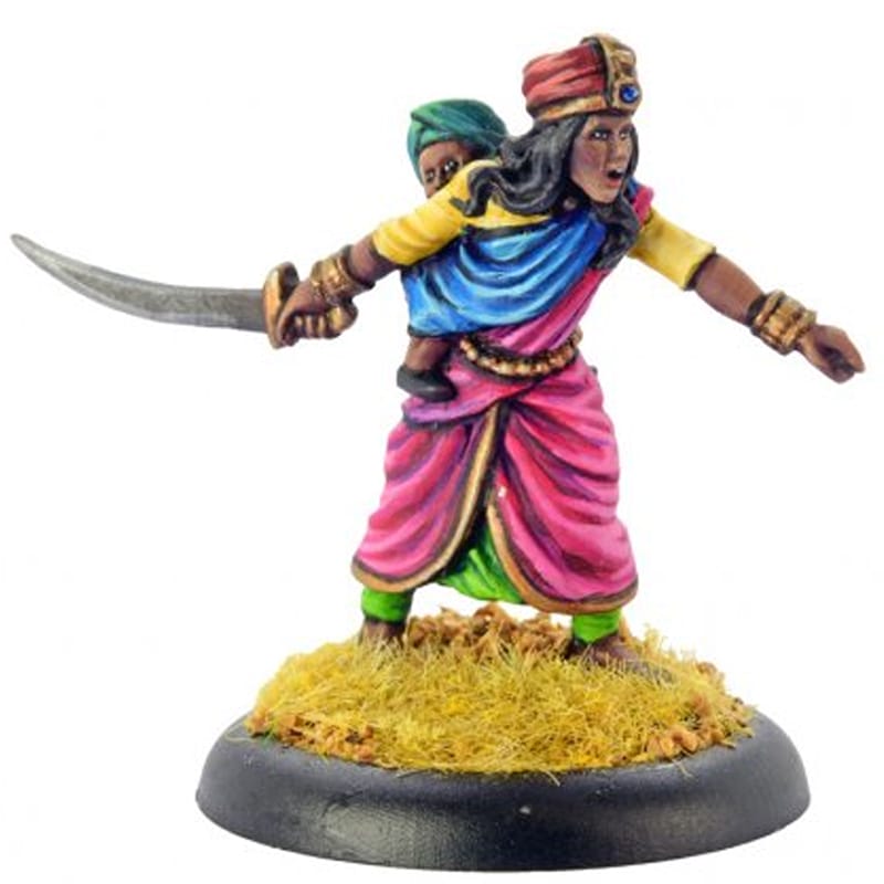 She is most famous for her escape from a besieged fort in her capital, Jhansi. According to folklore, she jumped from the fort’s walls on her horse Badal, with Damodar Rao, her adopted infant son, on her back; they survived but the horse died. Our figure features her carrying her son.