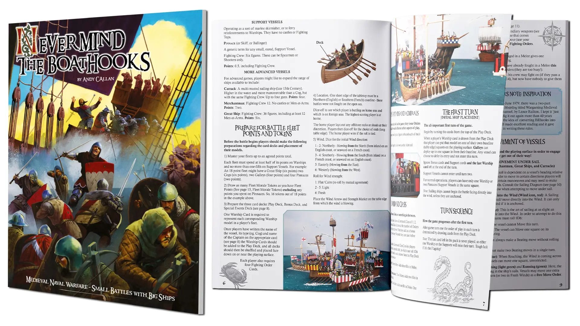 Boathooks is a set of late medieval naval wargames rules related to (but not requiring) its landlubbing forefather: Never Mind the Billhooks.