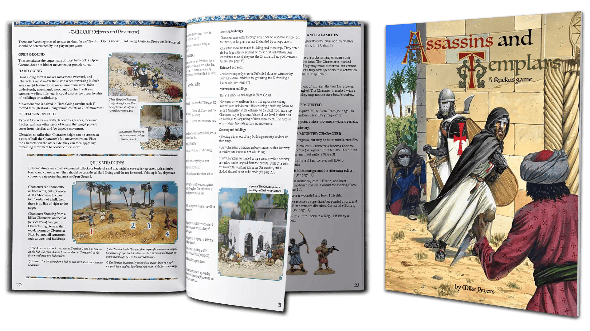 Assassins and Templars: A Ruckus Game is a self-contained 32-page rules booklet for playing games involving (typically) 12-figure per side. Assassin and Templar Heroes and Retainers take to the tabletop to play narrative-driven wargames on a scenery-heavy board.